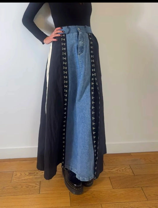 Fustă Lungă din Denim cu Inserții Contrastante | Talie Unică | Qarma Selection