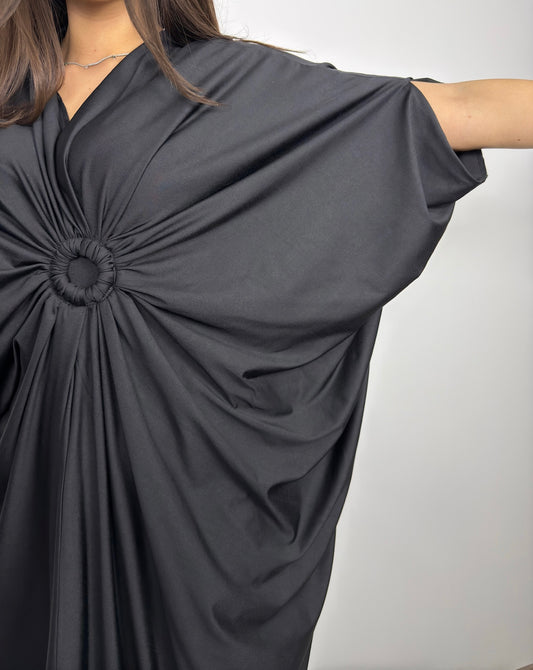 Rochie Neagră Fluidă din Jerse cu Inel | Talie Unică | Qarma