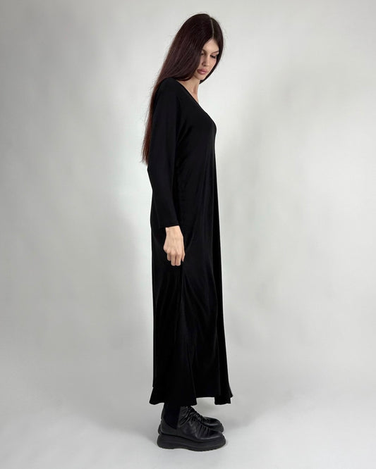 Rochie Lungă Neagră din Viscoză cu Șnur Ajustabil | Talie Unică | Qarma