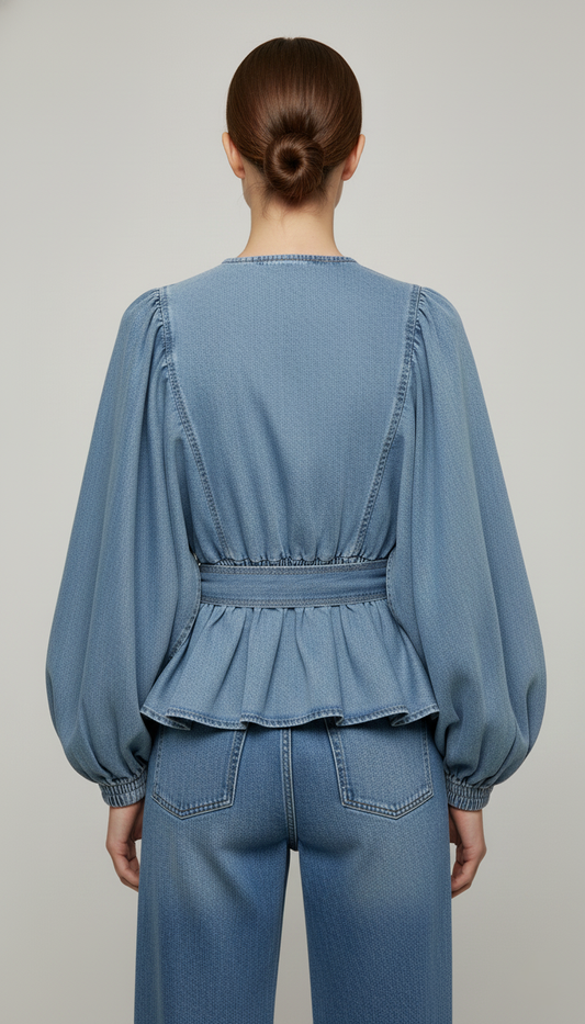 Bluză de Blugi cu Mâneci Balon și Peplum | Talie Unică | Qarma Selection