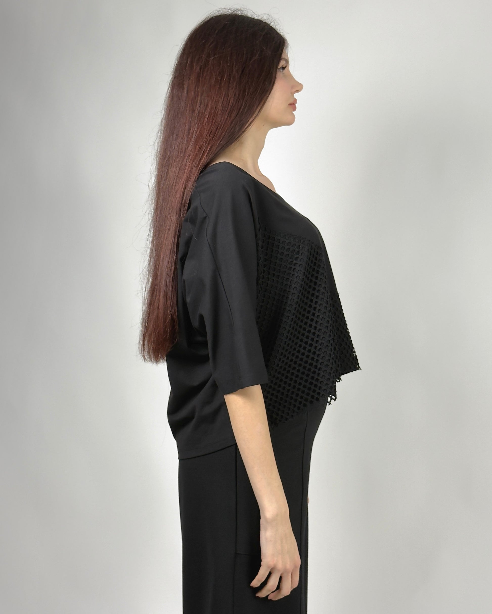 O piesă de design care combină minimalismul cu o textură urbană, brută. Această bluză este construită pe un joc de transparență și opacitate, având o inserție diagonală supradimensionată din plasă tehnică.