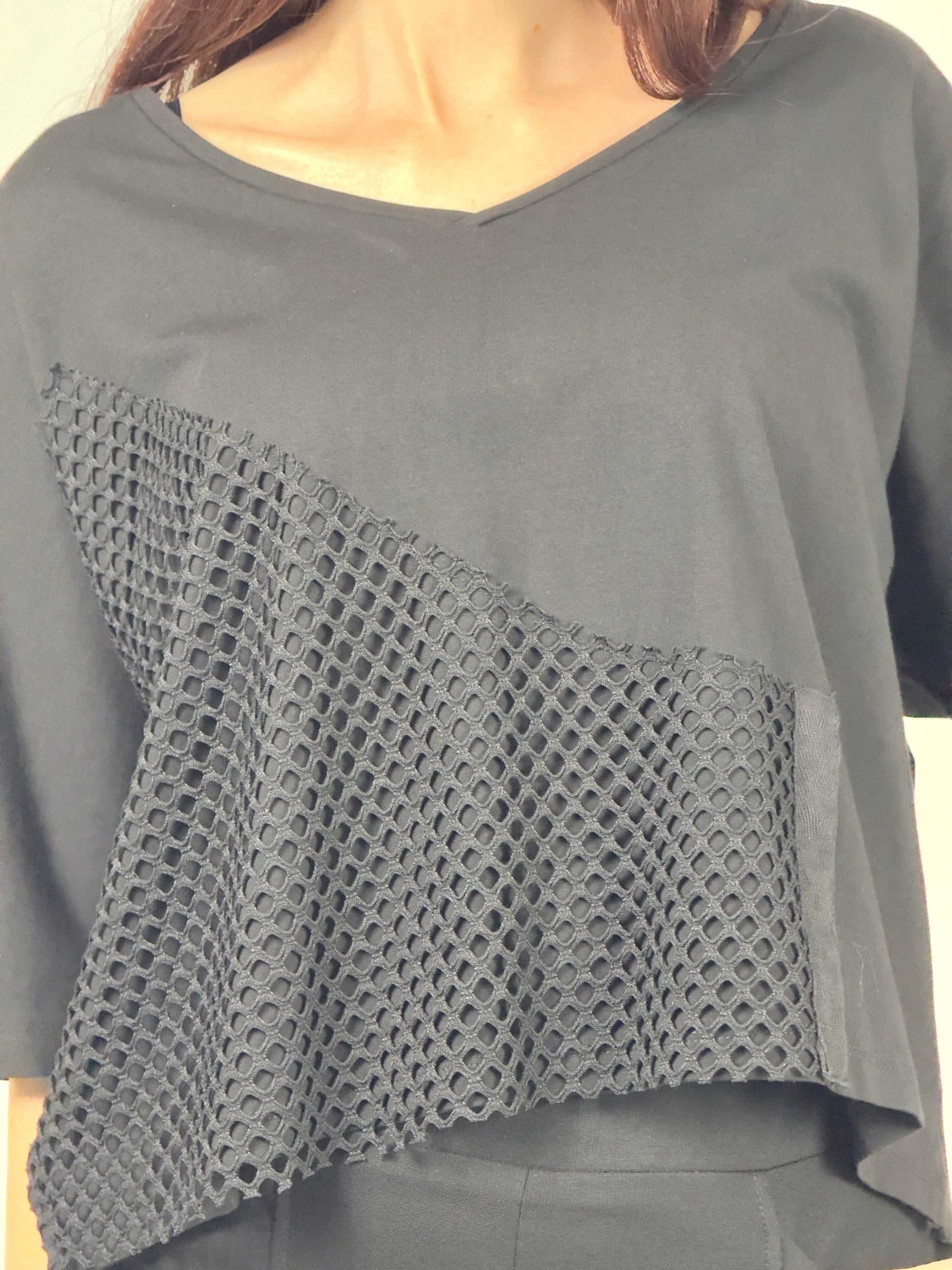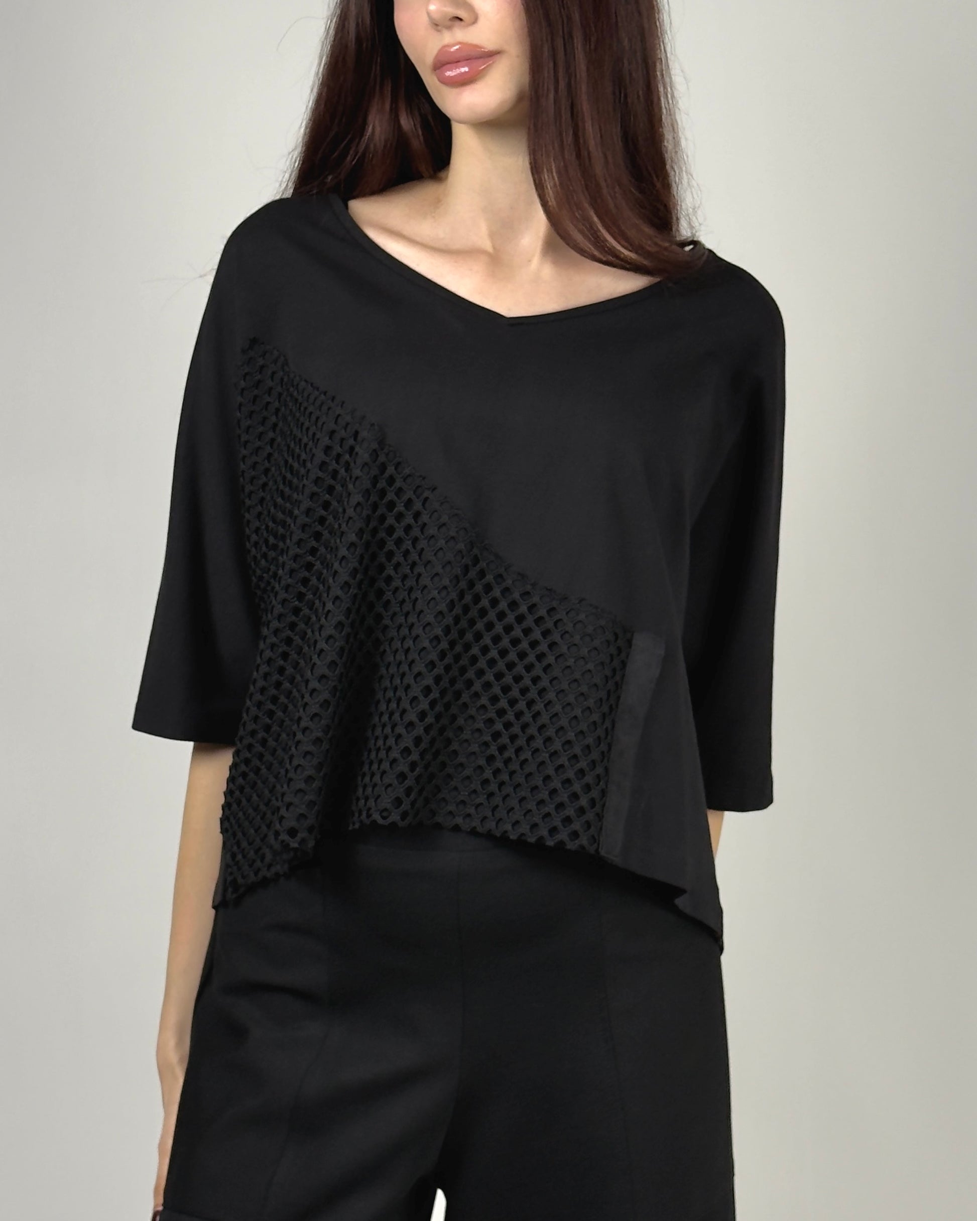 Realizată dintr-un amestec de bumbac confortabil, bluza are o croială lejeră, un decolteu în V subtil și un tiv asimetric care accentuează designul dinamic. Inserția de plasă nu este doar un detaliu, ci elementul central care definește piesa, oferind profunzime și un caracter modern, edgy.
