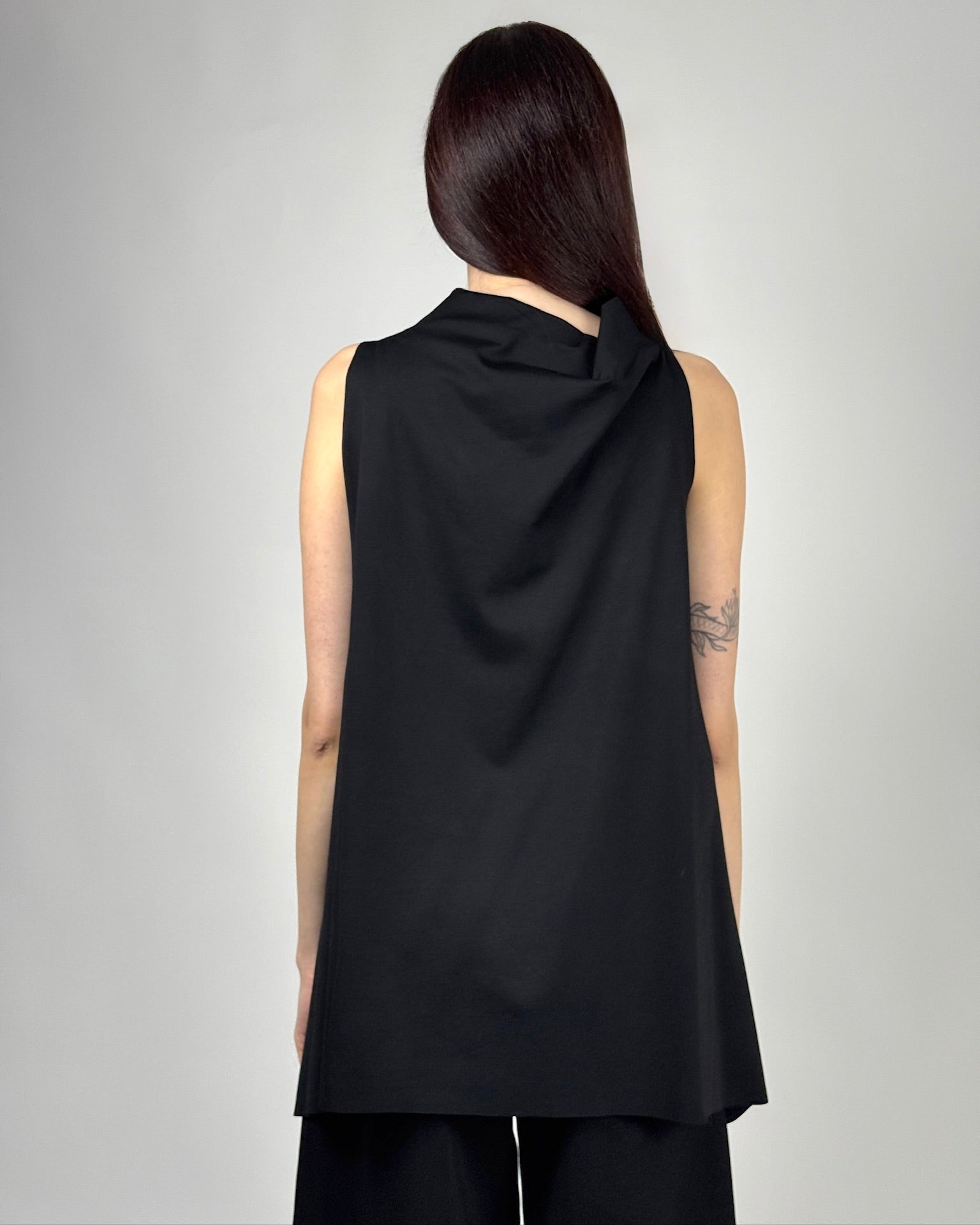O piesă declarativă, la granița dintre bluză și artă. Acest top asimetric este definit de o linie fluidă și o croială în unghiuri, care creează un joc interesant de volume și lungimi.