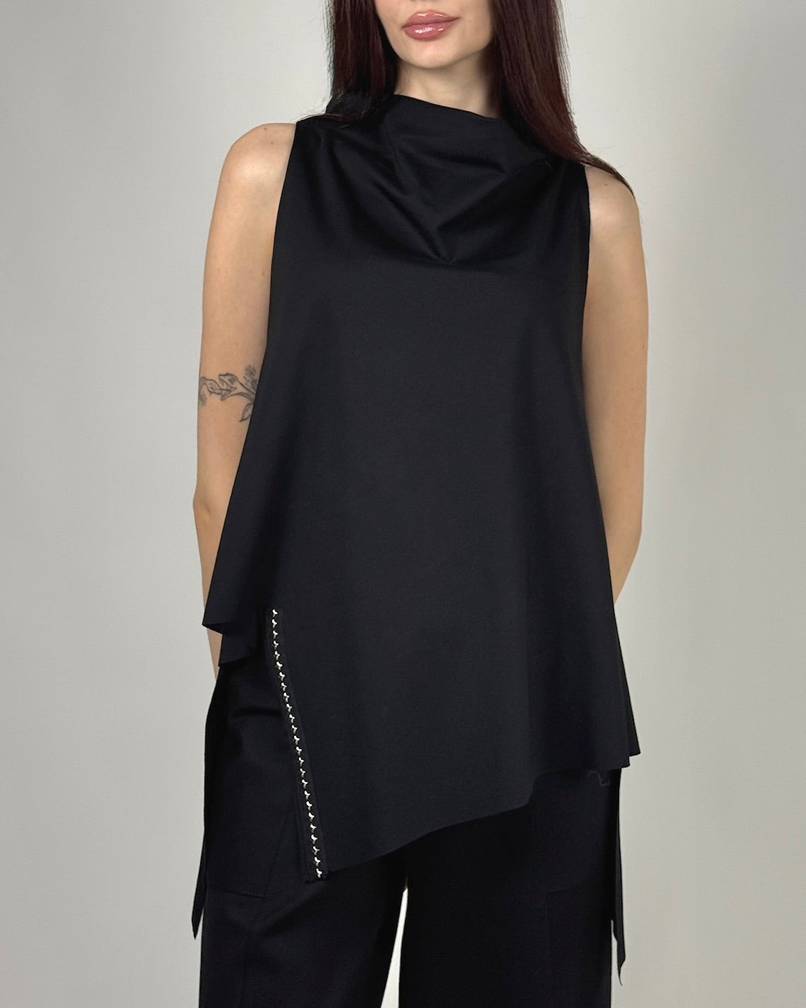 Realizat dintr-un amestec fluid de viscoză, topul evidențiază zona gâtului și creează o construcție lejeră, fără mâneci. Detaliul care îi conferă caracter este șirul de bride metalice (sau "capse") aplicate pe una dintre marginile asimetrice, adăugând o notă industrial-chic și un punct de interes grafic.
