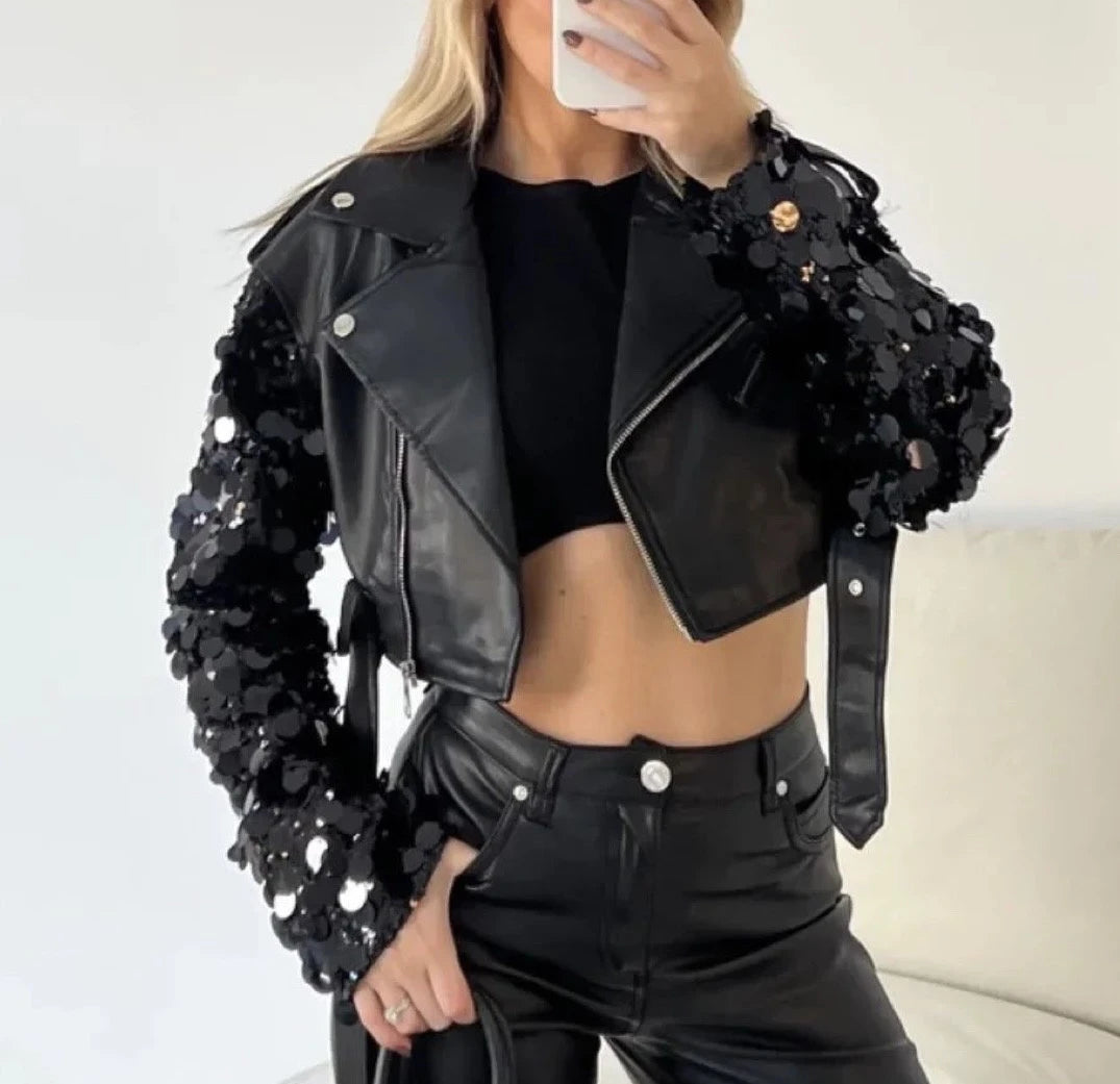 Geacă Biker din Piele Ecologică cu Mâneci din Paiete | Qarma Selection