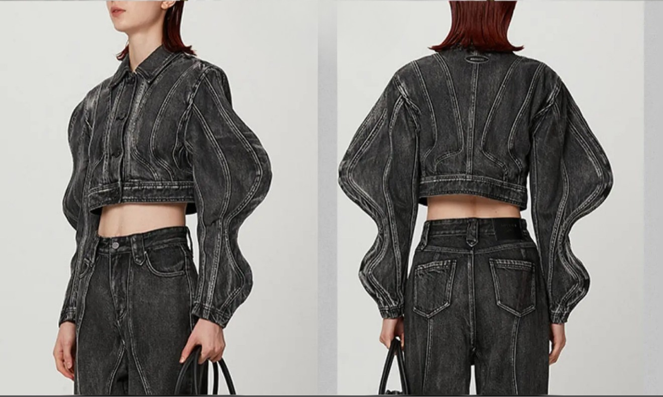 Fiecare detaliu este gândit pentru a crea o siluetă de neuitat. Mânecile sunt sculptate într-o formă dramatică, voluminasă, care contrastează puternic cu talia scurtă și marcată. Cusăturile vizibile, de tip corset, conturează corpul și adaugă structură, transformând denimul clasic într-o piesă avangardistă. Realizată dintr-un denim autentic, fără elasticitate, are o ținută fermă care îi menține forma sculpturală la fiecare purtare.