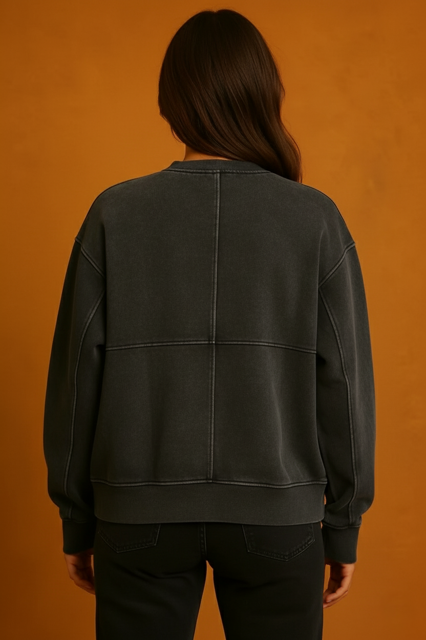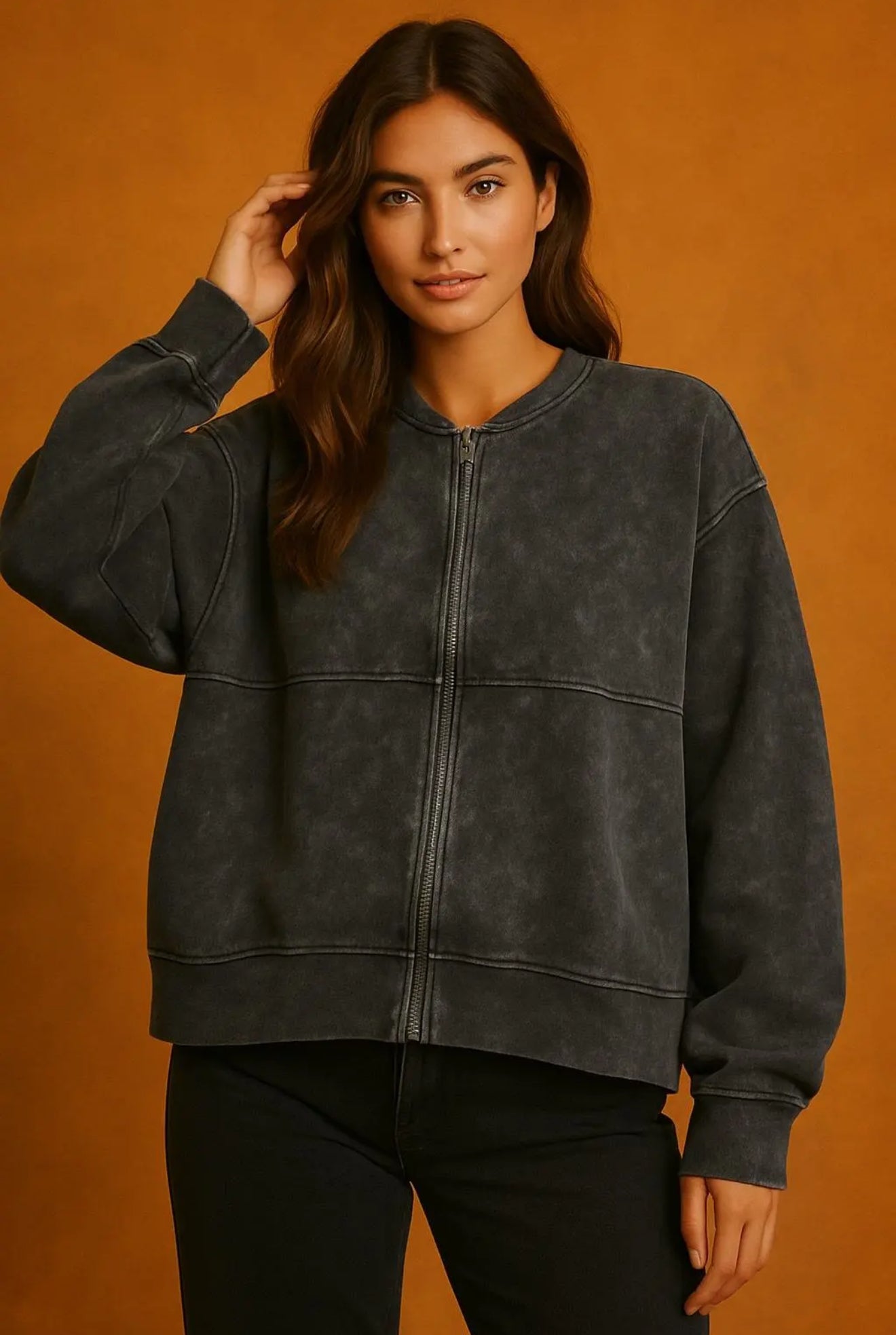 Realizată integral din bumbac moale, de înaltă calitate, această piesă este definită de textură și stil relaxat. Finisajul special, cu aspect prespălat (mineral wash), oferă o culoare unică, cu nuanțe subtile, și o senzație de articol deja îndrăgit, perfect integrat în garderobă. Designul curat, fără guler, cu un fermoar central și cusături vizibile, o transformă într-un articol extrem de versatil.
