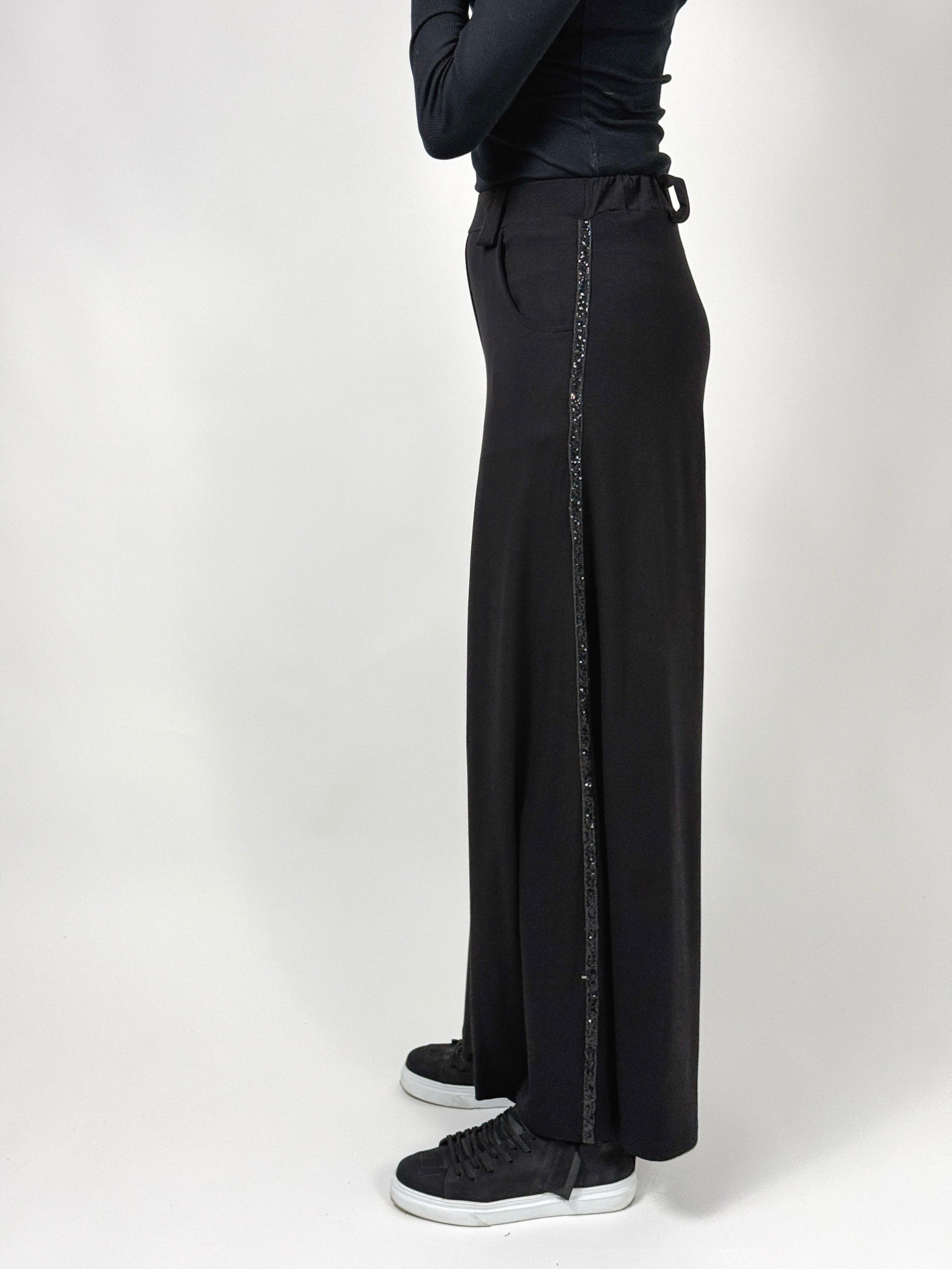 Eleganța fluidă a pantalonilor largi, rafinată printr-un detaliu prețios care se adaptează stilului tău. O piesă clasică, reinterpretată pentru a oferi un strop de strălucire discretă.