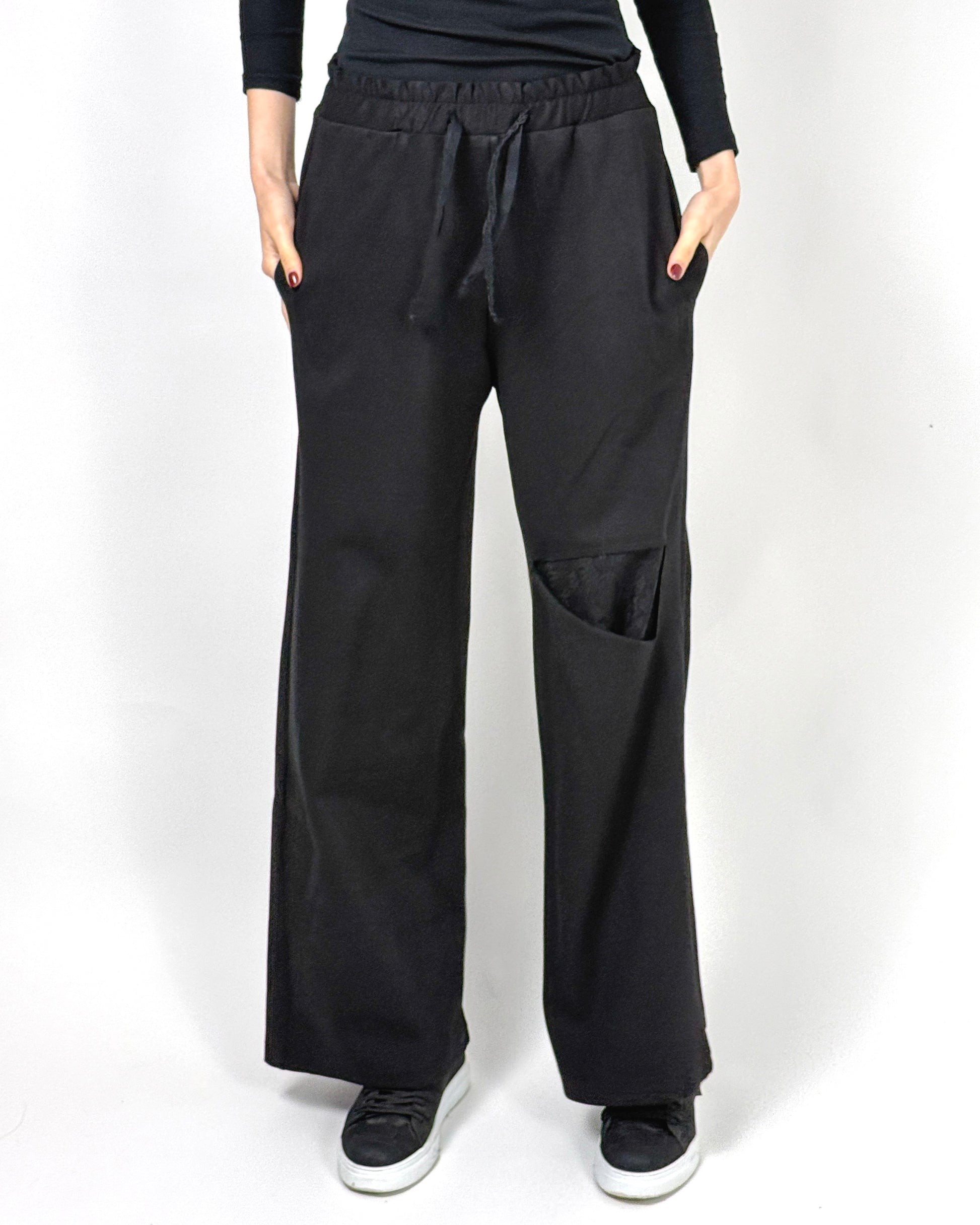 Realizați dintr-un amestec moale și fluid pe bază de viscoză, pantalonii au o croială largă (wide-leg) și o talie confortabilă cu șnur, asigurând o lejeritate absolută. Detaliul care îi scoate din anonimat este decupajul asimetric, plasat pe unul dintre picioare, care dezvăluie subtil un strat inferior texturat (posibil dantelă sau alt material contrastant) și adaugă o notă deconstruistă, artistică.