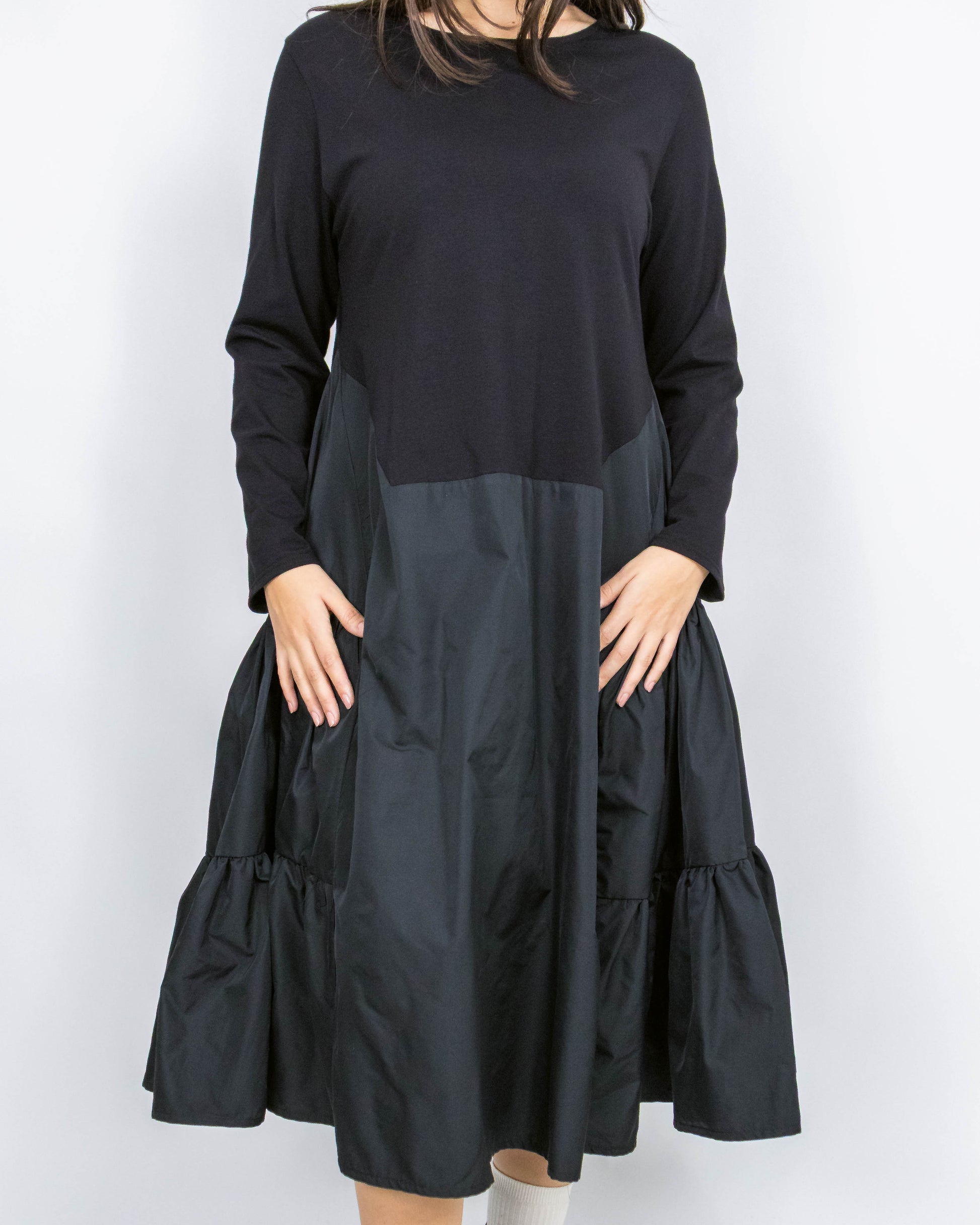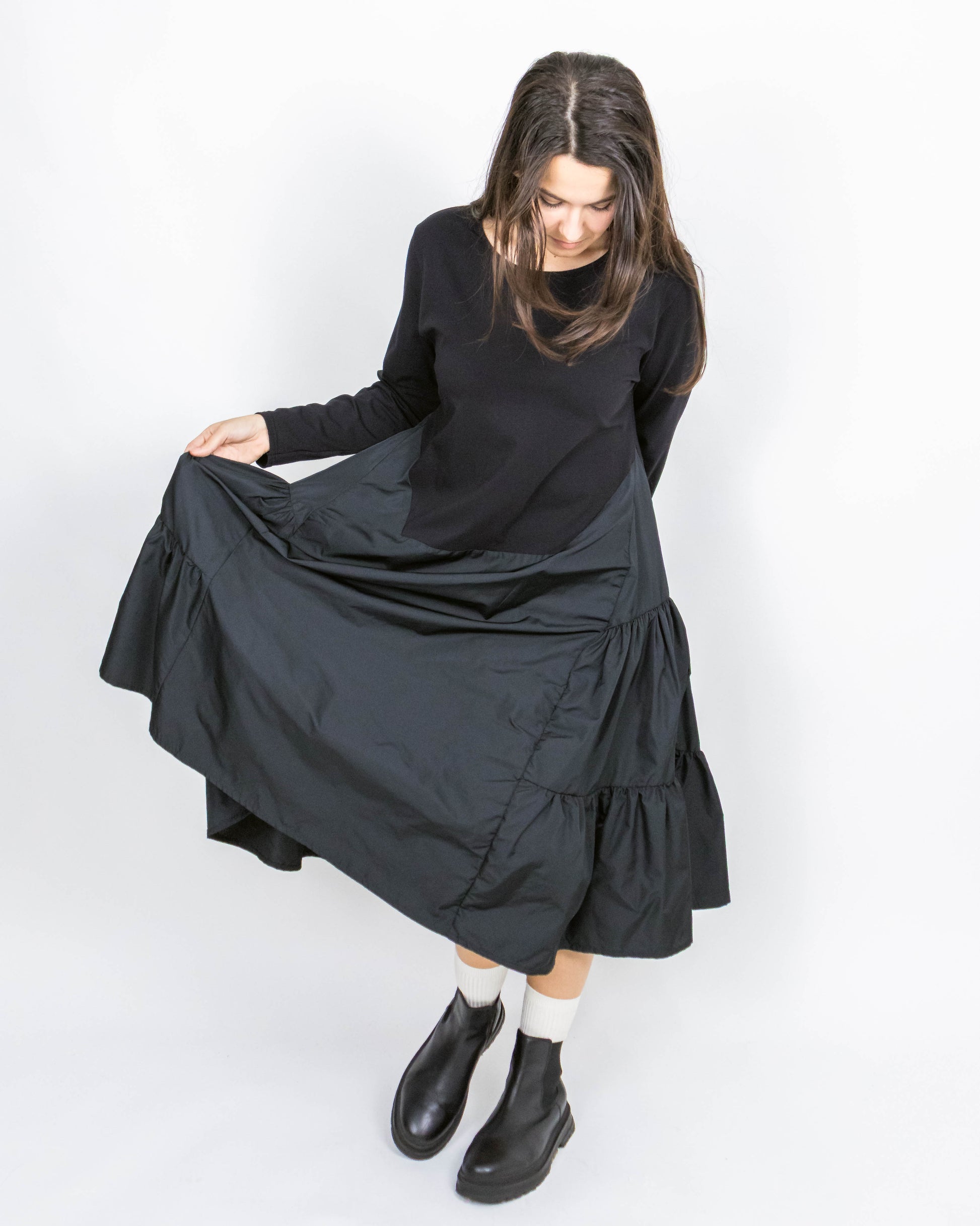 Aceasta nu este doar o rochie, este o declarație de stil urban. Creată pentru femeia care vrea "altceva", piesa combină genial confortul absolut al unui top elastic cu dramatismul unei fuste voluminoase.